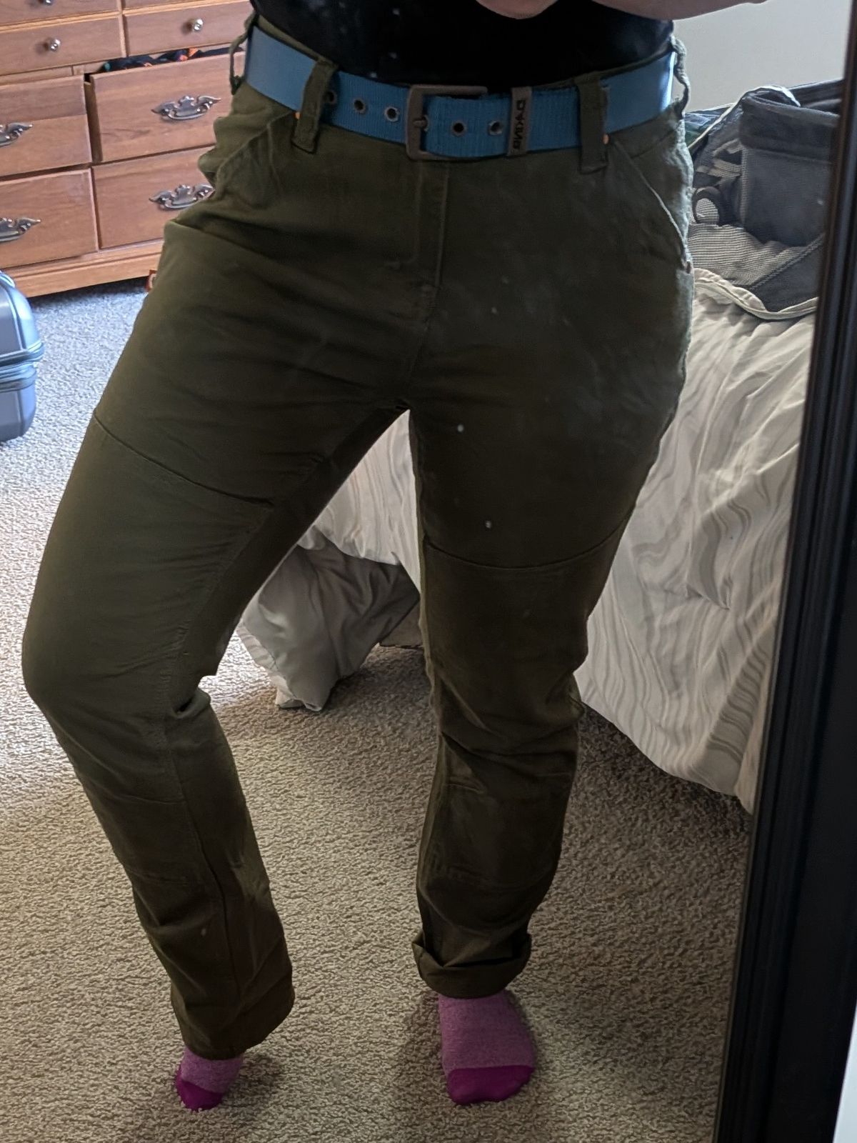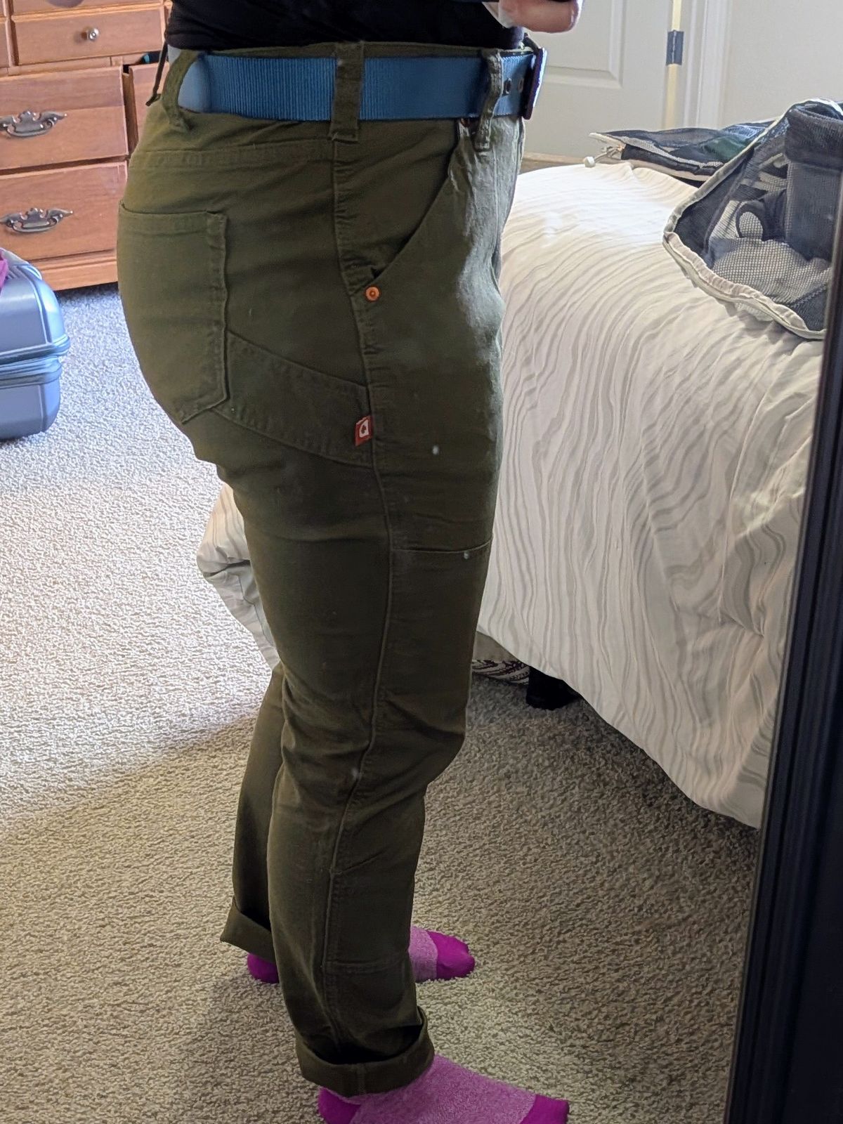 I don't typically wear "hard clothes". I like stretchy, soft, cozy clothes. But these feel great! And, look pretty nice too! I love the stretch (just right!) and the nice, deep pockets. Perfect for my barn chore shift at the rescue, and for hiking (both urban and in the mountains). Love the color, too.